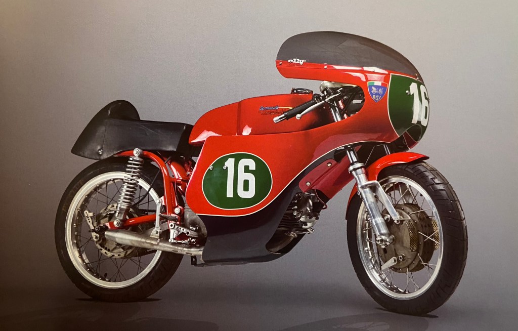 Aermacchi was an aeronautical factory converted during the post-war for the production of motorcycles. It merged with the Harley Davidson in the first year of the 70s and after a three-wheeler (Macchi MB1), a prototype of a scooter (la Dama), and the futuristic Chimera, Aermacchi produced a series of mono cylinder racing bikes. The prefix “Ala” remained in all the models’ names due to their lightweight and assertiveness.